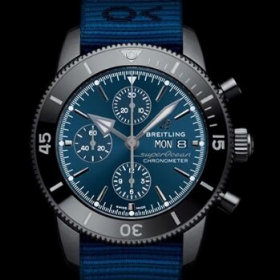 スーパーオーシャン ヘリテージ II クロノグラフ 44 アウターノウンは、ブラックのケース、この美しい時計の特徴は、ECONYL®ヤーンで作られた NATO ストラップです。この素材は、世界中の海洋で集められた漁網などのナイロン廃棄物から生成されたものです。