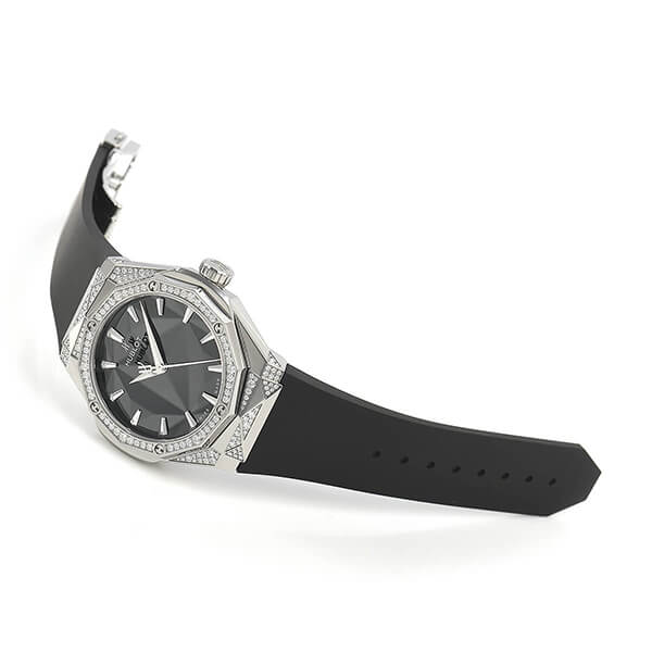 こちらはチタンのベゼルとケースにダイヤセッティングを施した豪華なオーリンスキーで、文字盤全面にはダイヤモンドのカットを彷彿させるファセット加工も施されており、キラキラと光を反射させ輝きを放ちます。